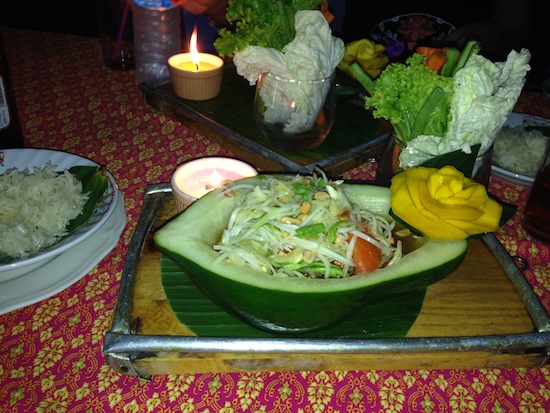 My favorite local restaurant serves Isaan food, the traditional food of Northeast Thailand, and som tam Thai, or green papaya salad, has become my absolute favorite food. Served with khao neyao, or sticky rice, moo or gai yang, or barbequed pork or chicken, and moo dai dio, or sundried pork, this makes a complete dinner to be shared with friends. I never ate pork at home, turning to turkey bacon to satisfy my cravings, and I was shocked at how much I loved it. I now eat pork almost every day, as it’s a staple in the Thai diet. I quickly learned there’s no room to be picky in this country.